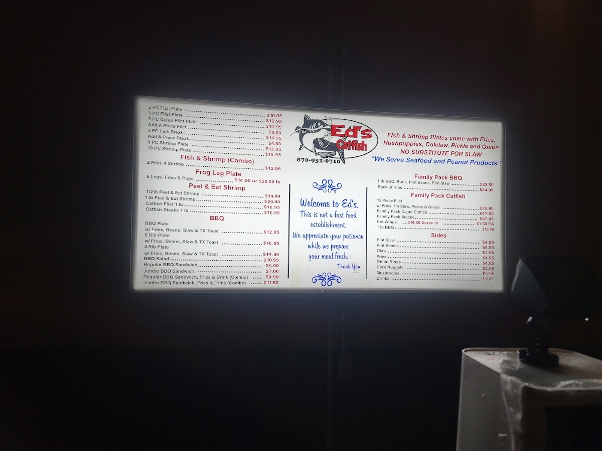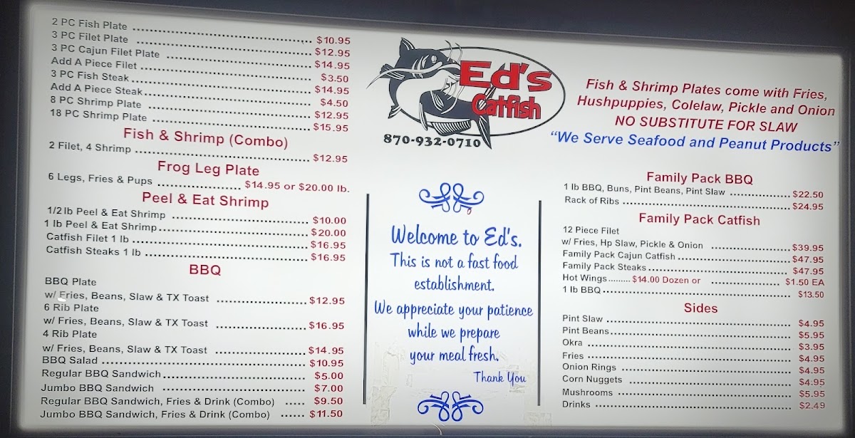 Welcome to Ed's Catfish & BBQ, a delightful establishment nestled in Jonesboro, AR, where Southern flavors come alive. The menu offers a tempting selection of freshly prepared dishes, notably their expertly fried catfish and mouthwatering BBQ options. You can dive into the 2-piece catfish filet plate, which comes with crispy French fries, coleslaw, hush puppies, and tangy pickles for just $7.95. For something heartier, try the BBQ plate, featuring tender chopped BBQ meat, baked beans, and Texas toast for only $8.95.